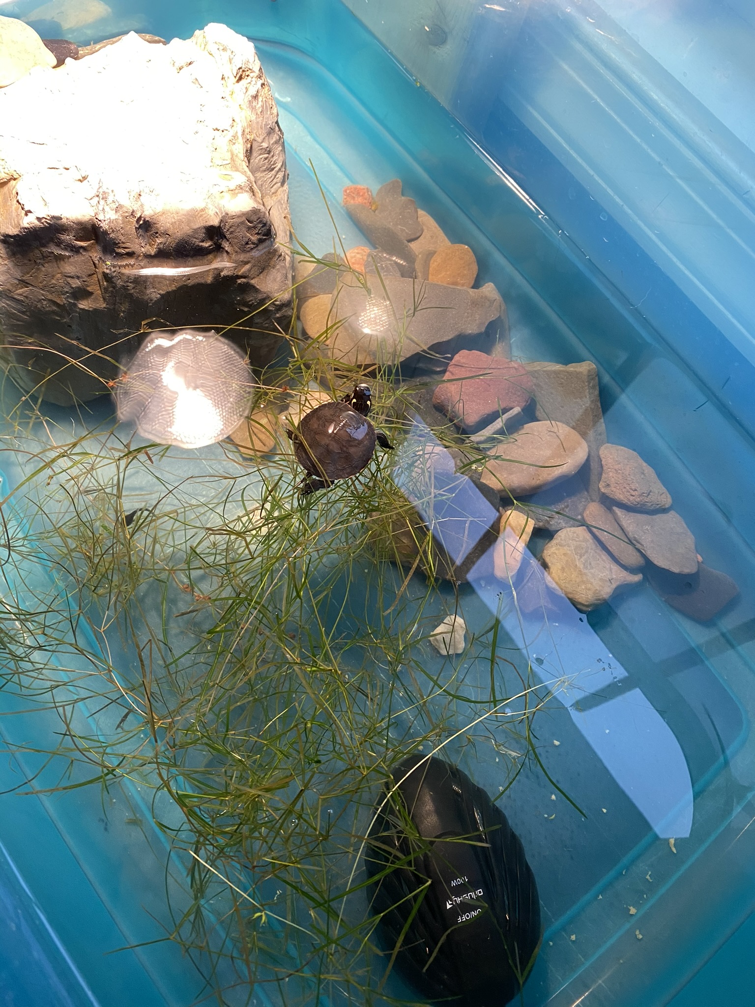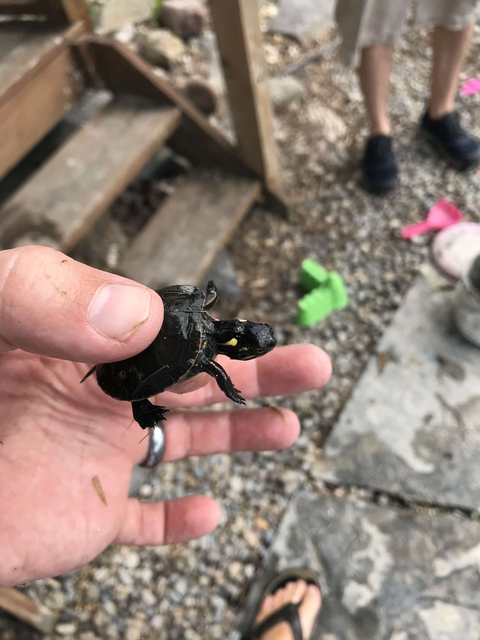 I found Squirty, a baby eastern painted water turtle, in July of 2020 when I picking up seaweed at my grandmothers lake house. Normally we find dead fish mixed in with the seaweed and on occasion we’ll find crayfish but I’ve never found a turtle in all my years of pitchforking the stuff. Based on the winds at the time, we figured he must have floated with a patch of seaweed from the northern part of the lake. Facing a sure death if I had put him back in the lake given his size, we decided to keep him. Plus my kids were already emotionally connected to him 😉